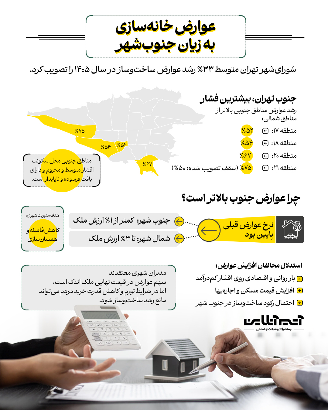 در سال آینده متوسط رشد عوارض ساختوساز در شهر تهران ۳۳ درصد خواهد بود. رشد عوارض در مناطق جنوبی تهران بالاتر از مناطق شمالی است. در این تصویر جزییات تصویب عوارض ساختوساز را ببینید.